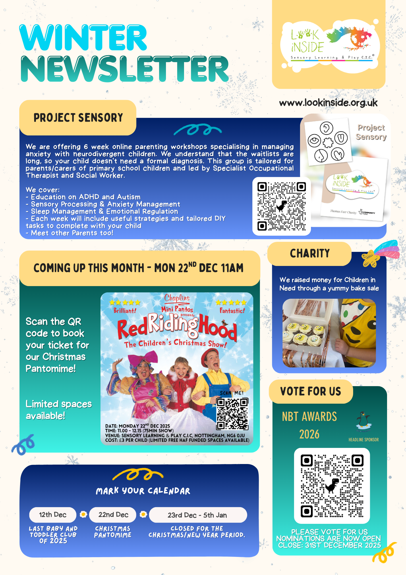 Look Inside Sensory Learning & Play C.I.C. provide a safe, stimulating environment for all children, including those with additional learning needs. The children will play and develop new skills through sensory equipment, free play and structured play sessions. Pre-school benefits from fun sessions and free play, which include Child Intervention Based on Theraplay® Principles and parent-toddler sessions. Children and young people aged 6-25 benefit from focused support, such as; mentoring, Child Intervention Based on Theraplay® Principles, behavioural strategies and counselling. Communities gain advice and support for; budgeting, parenting, family mediation/counselling and social boundaries groups. We are at the heart of the community providing a hub of much needed services. We now offer Short Break Services for children & young people with a disability who are unable to access universal services.
